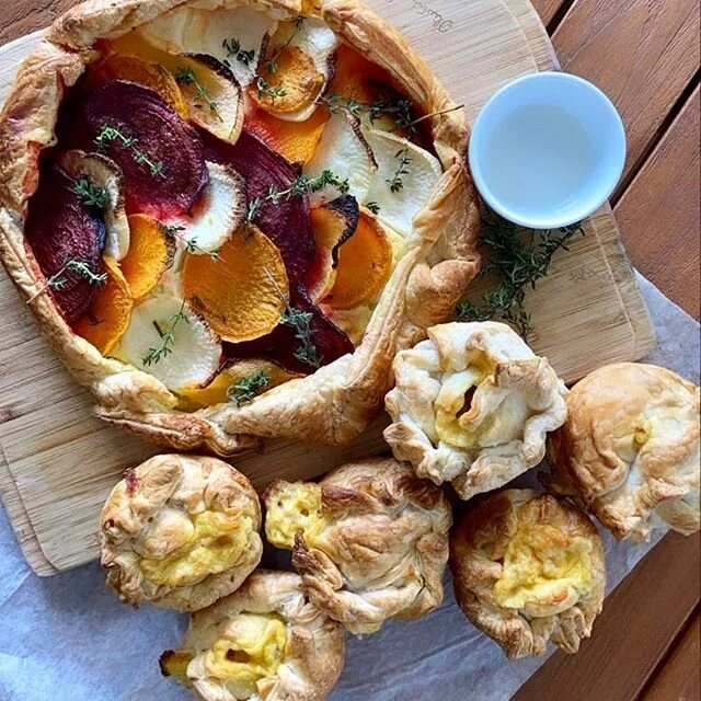 7. Cut one piece of puff pastry into a square that will fit the size of your tin, leaving some over hang of pastry so the top piece can joined with the bottom.